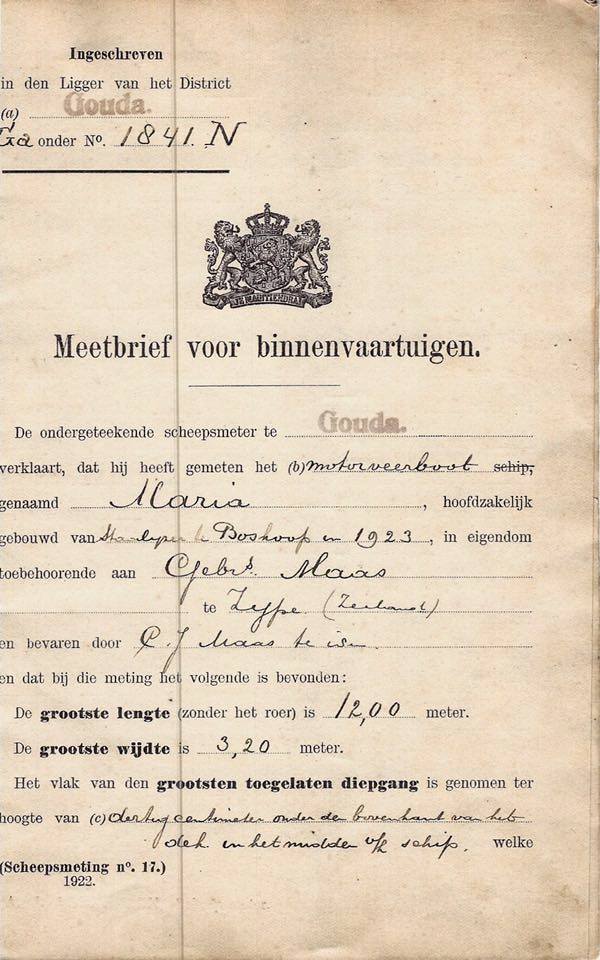 De Maria werd gebouwd bij N.V. Scheepswerf Akerboom te Boskoop, zoals te lezen in onderstaande ‘ligger’ van de Scheepsmetingsdienst.