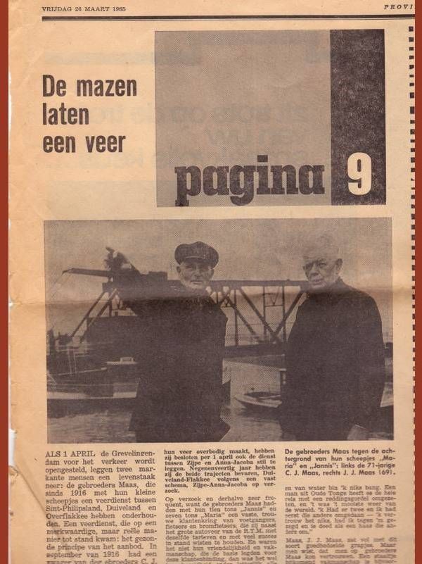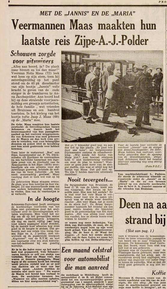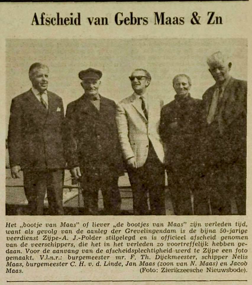 Na bijna 50 jaar, waarvan 42 jaar met de Maria, valt het doek voor de veerdienst Zijpe-Anna Jacobapolder, evenals voor de veerdiensten met de Jannis naar Goeree. De aanleg van de Grevelingendam (tussen Schouwen en Goeree) heeft de veerdiensten overbodig gemaakt en de gebroeders Maas gaan met pensioen. Alle regionale kranten wijden er aandacht aan en blikken terug.